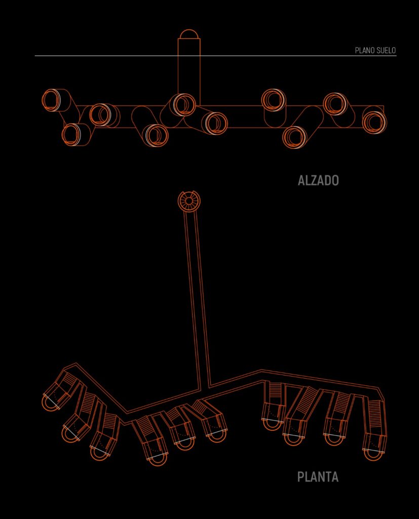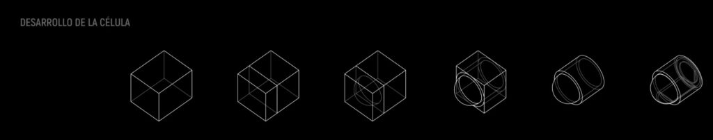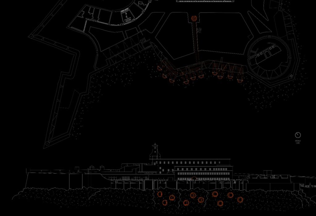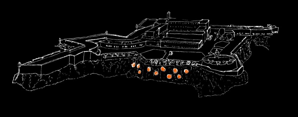 El proyecto parte de una figura elemental: la cúpula. Desde esa forma inicial se exploraron distintas posibilidades de emplazamiento hasta encontrar en el acantilado de la fortaleza el lugar idóneo para implantar una serie de cúpulas agrupadas, configurando una pequeña colonia.