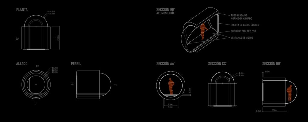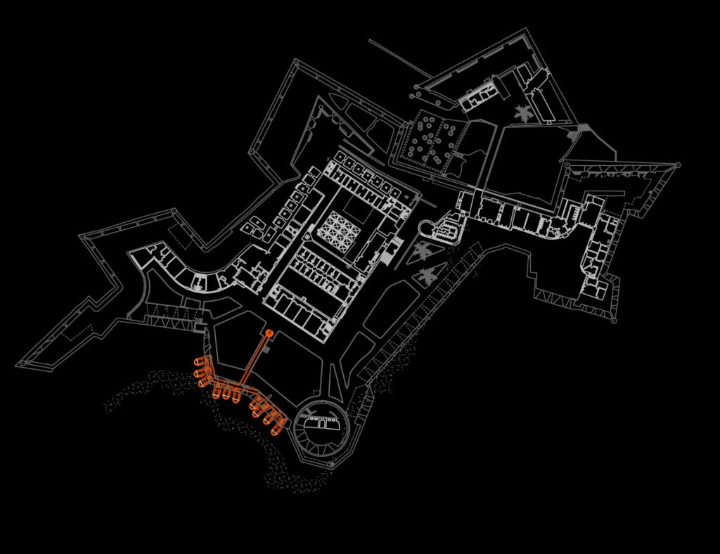 La propuesta plantea que estas cúpulas solo sean visibles desde el mar, sin permitir el acceso desde él. Desde tierra, en cambio, el conjunto permanece oculto, y la entrada se localiza discretamente para dar paso a un sistema de túneles subterráneos que conducen a cada celda individual. Una vez en el interior, la mirada se dirige exclusivamente hacia el horizonte marino.